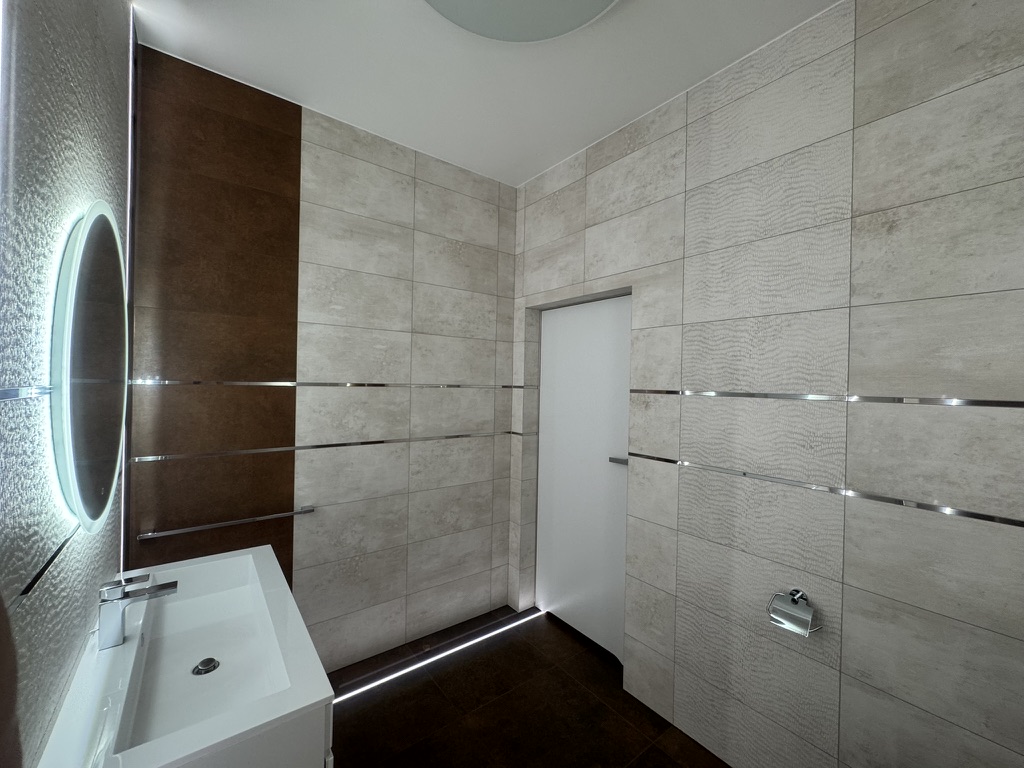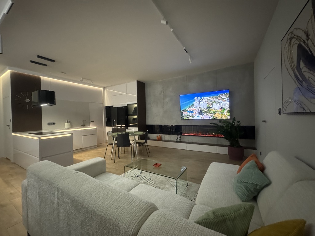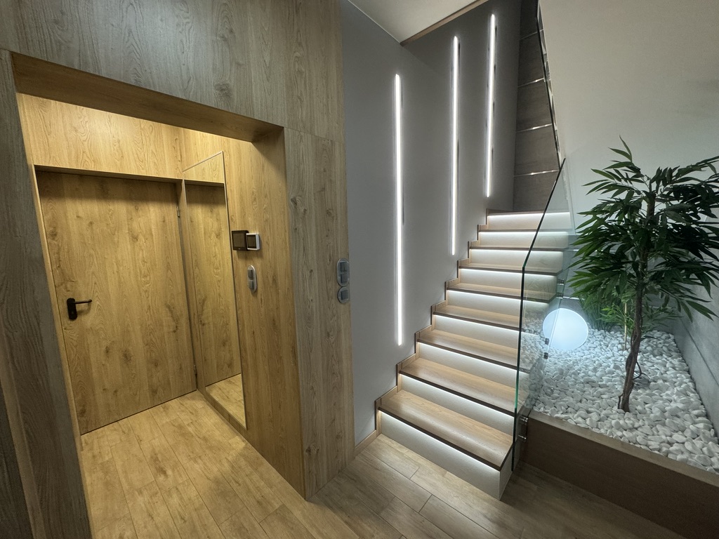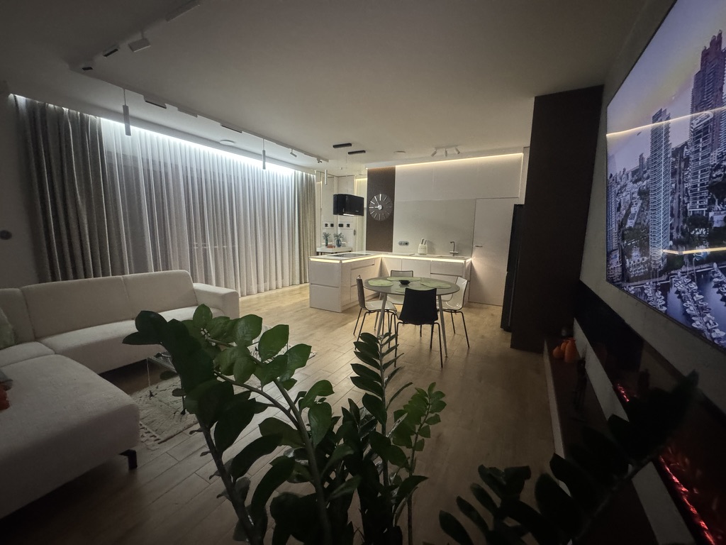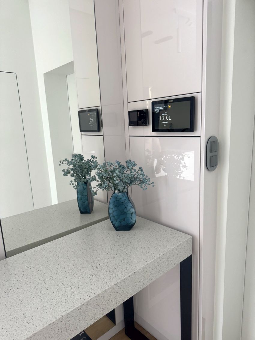 Nieruchomość wyposaż ona jest w instalację fotowoltaiczną o mocy 7,5 kW, co dodatkowo obniż a koszty eksploatacyjne. W domu zastosowano nowoczesne rozwiązania typu smart home, w tym zdalnie sterowane rolety zewnętrzne z automatycznymi sezonowymi scenariuszami pracy, system alarmowy, monitoring z podglądem online oraz wideodomofon obsługiwany również z poziomu telefonu. Budynek posiada dostęp do światłowodu o prędkości 1 Gb/s oraz pełną infrastrukturę sieci Wi-Fi.