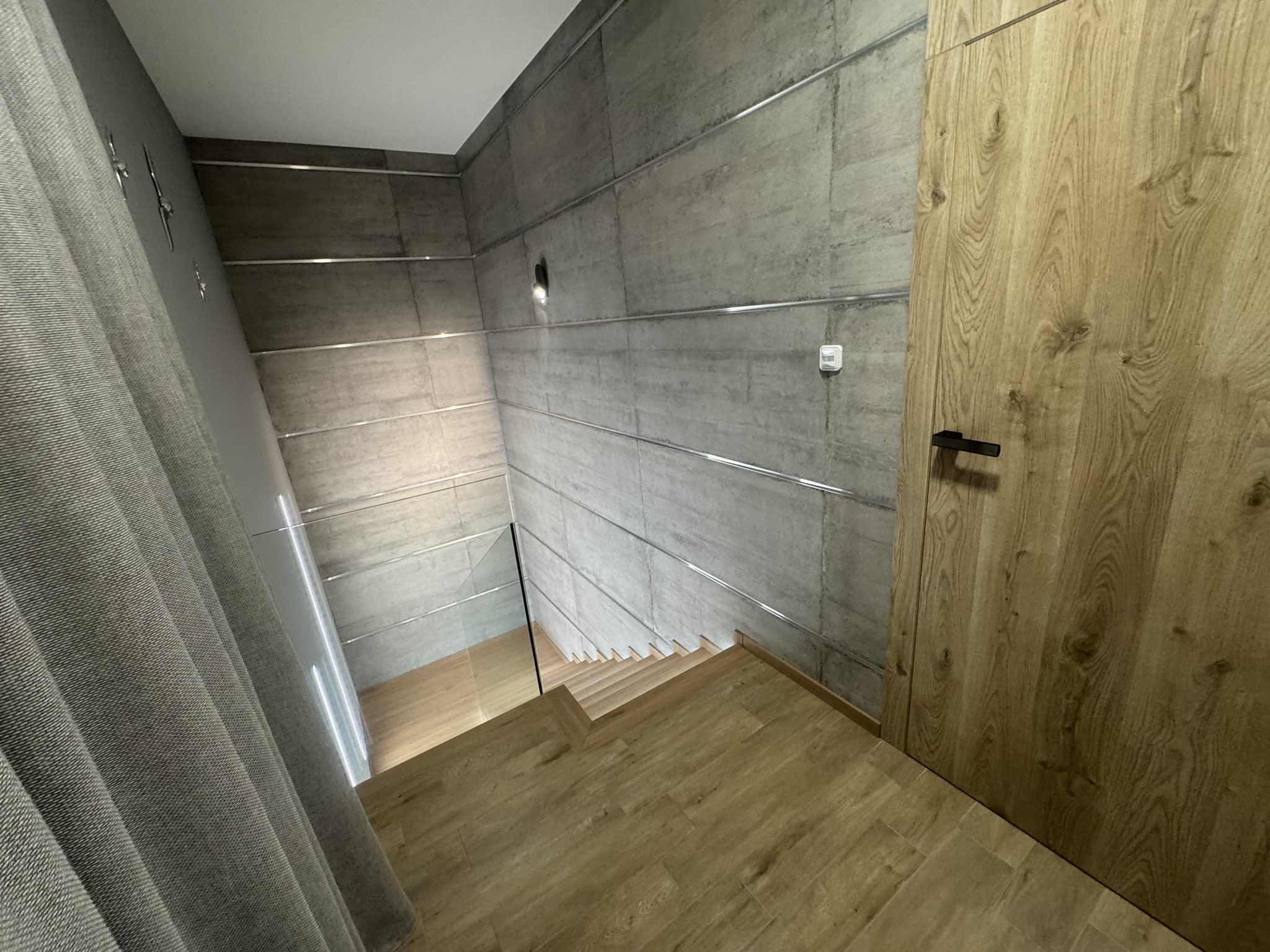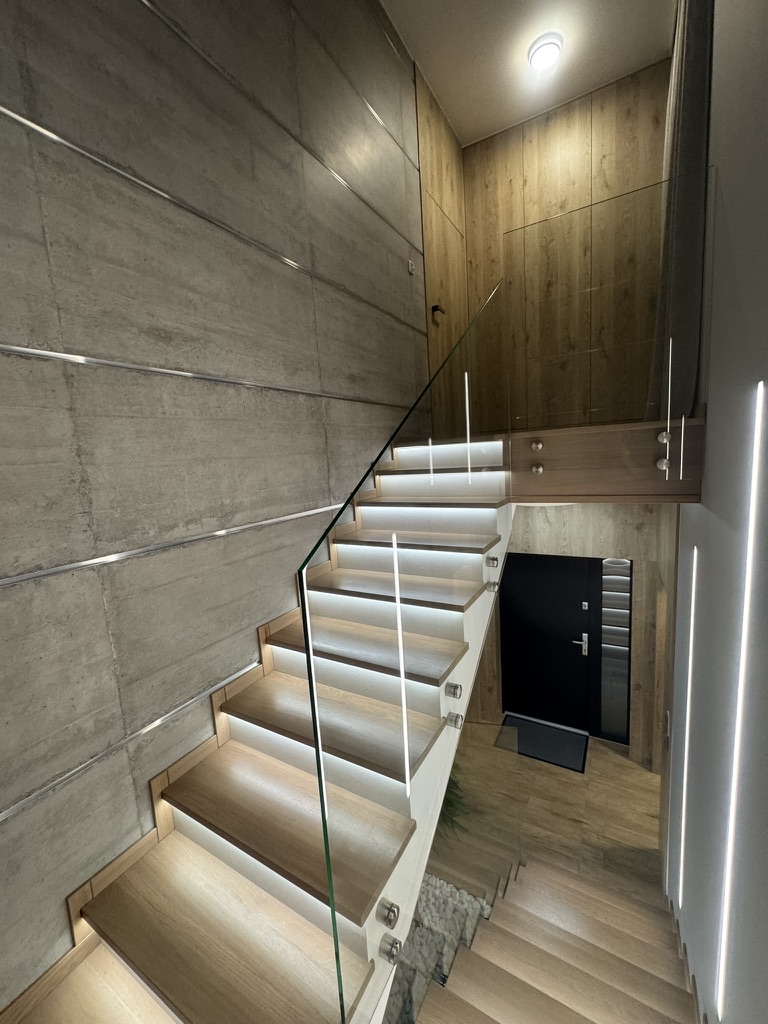Piętro stanowi niezależne mieszkanie z salonem i aneksem kuchennym połączonym z jadalnią, sypialnią z prywatną łazienką oraz oddzielnym WC.